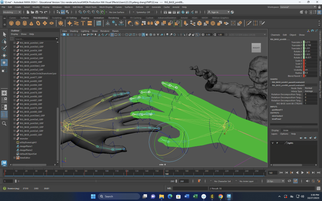 In the post-production phase, Ruijia took charge of the majority of the special effects, while I contributed within my capabilities by handling some assets. My primary responsibility was the synthesis of content, with Ruijia assisting in parts of the process. During synthesis, I discovered many issues stemming from early mistakes, such as the inability to achieve precise tracking due to camera shake, necessitating manual adjustments frame by frame in many areas. Additionally, combining 3D content with live-action proved to be a challenging task. Errors in lighting, tracking, and color grading resulted in some of my assets appearing disjointed from the live-action scenes. However, through continual experimentation, innovation, and efforts to rectify shortcomings, I acquired a wealth of new skills. For instance, I am now proficient in various methods of camera stabilization and have a solid understanding of 3D tracking in NUKE. The diverse experiences throughout this process have undoubtedly been valuable.