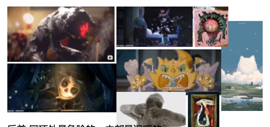 Contrast Dangerous outside the roof, warm inside Dangerous elements: monsters, black