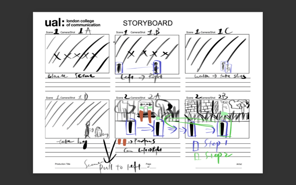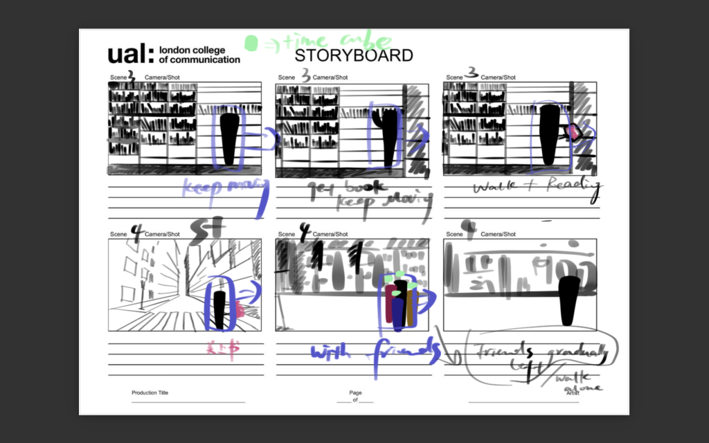 2.1 Bridging to the previous scene, I walk from left to right through the st with my guitar on my back. (picks up a book halfway through or something) | Street | |