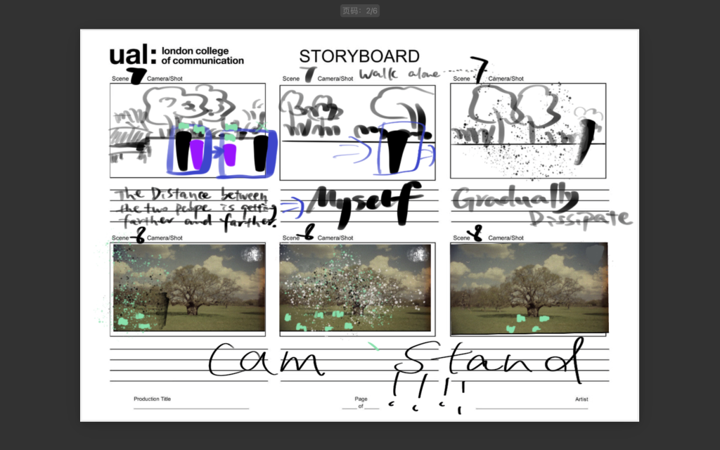 6.1 As I walked, I was the only one left. I walked into the grass, walking slower and slower; while walking, my body while dissipating, others sent me the time cut pieces also while falling, and finally I turned into particles under a tree all floated away, the time cut pieces also all fell. The only thing in the picture were the time pieces left to me by others along the way lying quietly on the ground; there was the sound of the wind | Park (Under the tree) | |