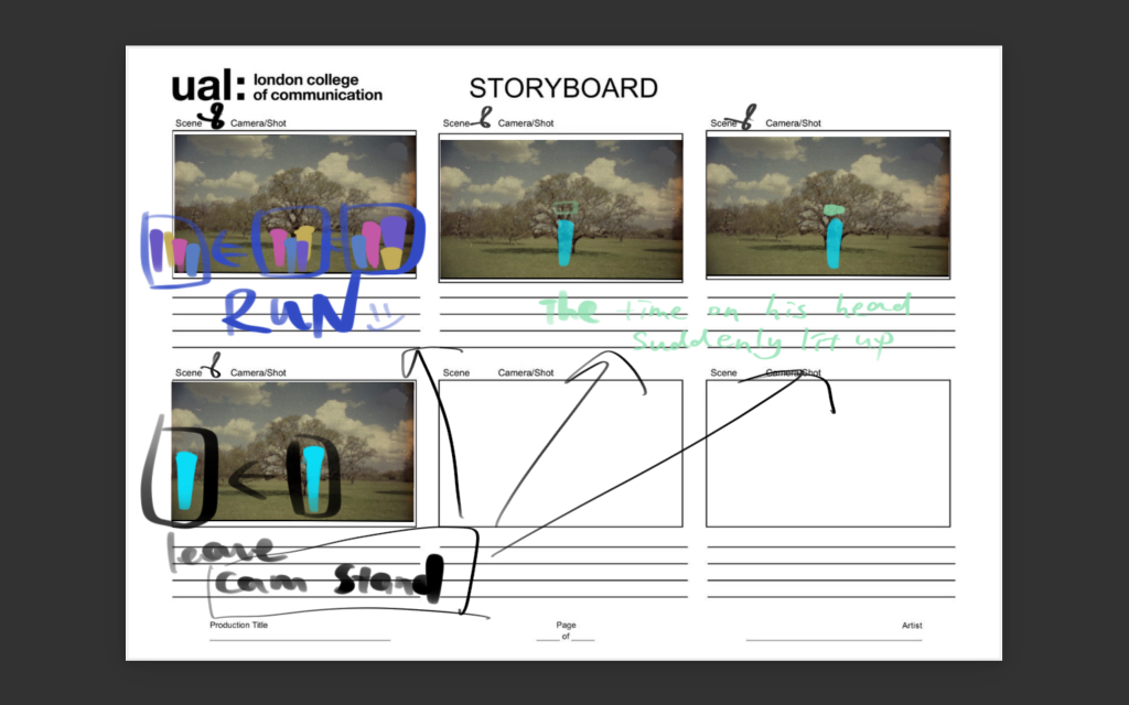 6.2 The scene is still for a few seconds, with the sounds of nature; a group of people run into the shot from the other direction in the foreground (from right to left). At this point, a group of people run into the shot from the other direction in the foreground (from right to left); full of laughter, when the last of them runs into the frame to reveal a tree, the distant view reveals a man I once met, who stands and stops under the tree, and then the time cutout on his head lights up; and then he walks out of the frame from the right side. | Park (Under the tree) | |